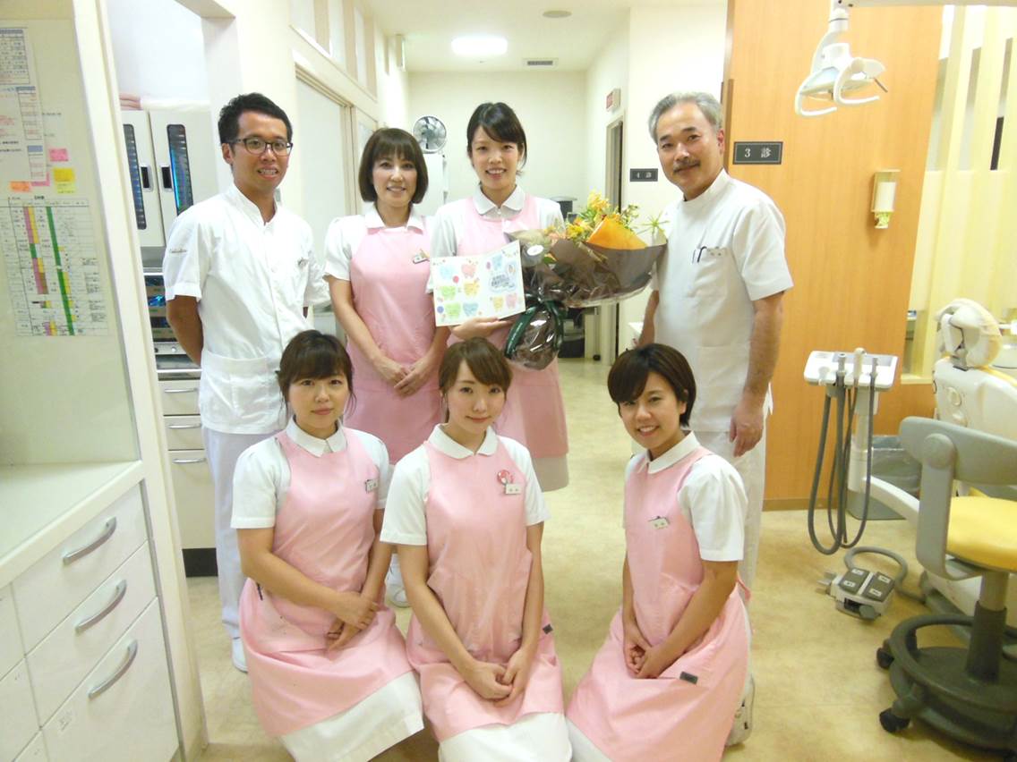 林さんラスト出勤 2018年9月8日 スタッフブログ 衛生士の林さんが出産を控えて9月8日(土)が最後の出勤となりました。診療終了後に花束贈呈を行い、皆からのメッセージを書いた色紙をお渡ししました。大変喜んでもらえてよかったです。