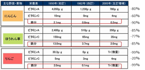 クマなどの症状が現れることがあります。現代の野菜や果物のビタミン&ミネラルがこんなにも減少